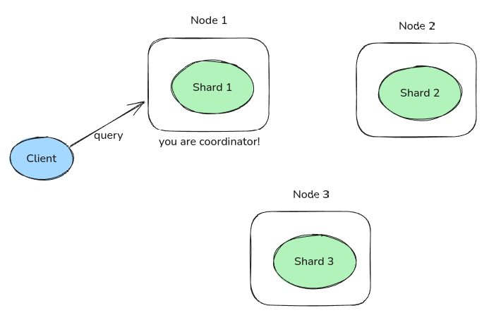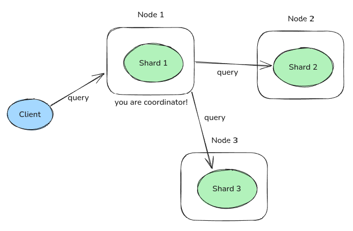 coordinating node๊ฐ ๋ Node 1 ์ค๋๋ ๋ฐ์ดํฐ๊ฐ ๋ถํ ์ ์ฅ๋ ๋ชจ๋ ์ค๋๋ฅผ ์ฐพ์์ ์ฟผ๋ฆฌ๋ฅผ ๋ ๋๋ฆฐ๋ค.
