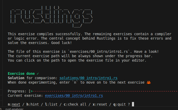 ๋๋ ํฐ๋ฆฌ๋ก ์ด๋ํด์ rustlings๋ฅผ ์ ๋ ฅํ๋ฉด, ๊ทธ๋๋ก ํฐ๋ฏธ๋ ๊ธฐ๋ฐ์ UI๊ฐ ์์๋๋ค.