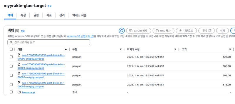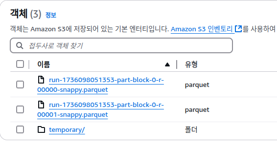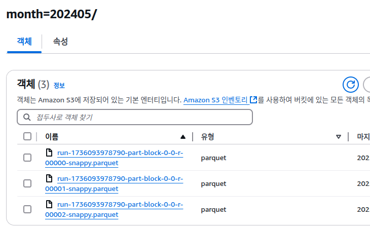 ๊ทธ๋ฆฌ๊ณ ๊ฒฐ๊ณผ๋ฌผ ๋ฒํท ๊ฒฝ๋ก์ ๋ค์ด๊ฐ๋ณด๋ฉด, parquet ํ์ผ๋ค์ด ๋ค์ด๊ฐ์์ ๊ฒ์ด๋ค.