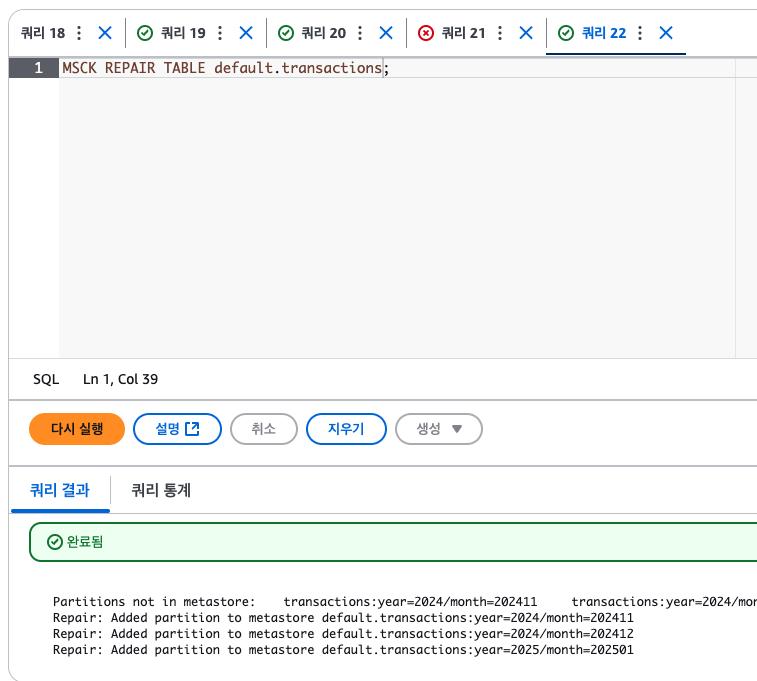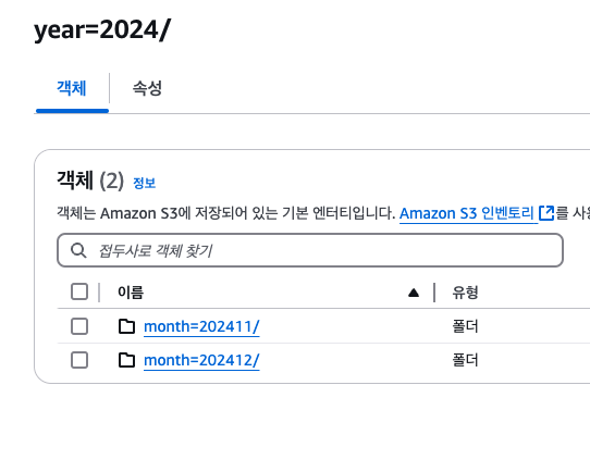 이걸 다시 반영하려면 파티션을 매핑해줘야 하는데, 위에서 한 MSCK REPAIR는 모든 범위를 풀스캔하는 것이라서 지속적으로 사용하기엔 비효율적이고, 처음에만 사용하는 용도라고 봐야 한다.
