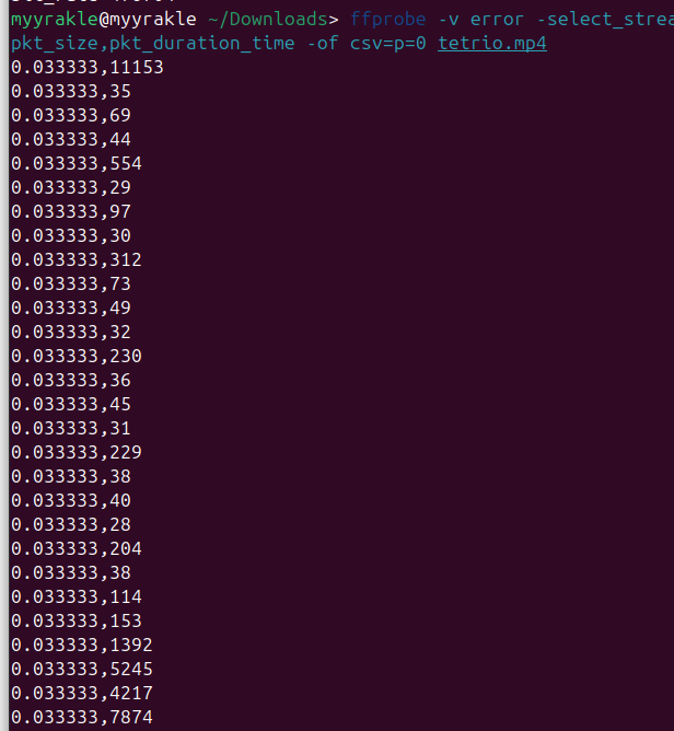 ffprobe -v error -select_streams v:0 -show_entries frame=pkt_size,pkt_duration_time -of csv=p=0 tetrio.mp4