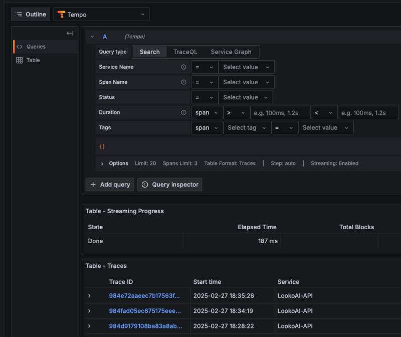 ๊ทผ๋ฐ ์ด๋ฐ ๋ฐฉ์์ ์ข ๋ถํธํ๊ธฐ๋ ํ๊ณ , ๋ณดํต traceQL์ด๋ผ๋ ํ์ฅ ๊ตฌ๋ฌธ์ ํตํด์ Grafana์์ ์ง์ ์๋ ํํ๋ก ์์ฃผ ์ด๋ค.