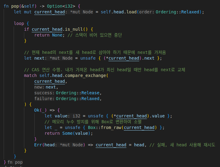 ๊ทผ๋ฐ Push/Pop์ ๋์์ ์ผ๋ก ๋ค์ด์ฌ ์ ์๊ณ head๊ฐ ์ธ์ ๋ ๋ฐ๋์ด์์ ์ ์๊ธฐ ๋๋ฌธ์, compare_exchange(compare and swap)์ผ๋ก ๋ณธ์ธ์ด ์๋ ์ ๋ณด๊ฐ ์ต์ ์ผ ๋๋ง ์์ ์ ํ๋๋ก ํ๋ค.