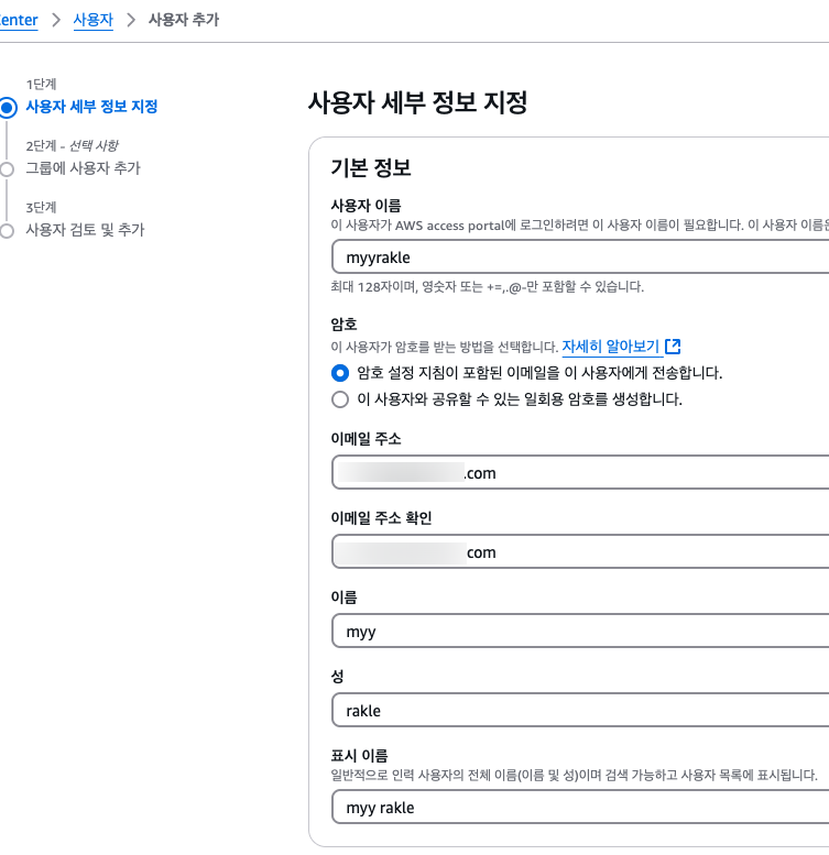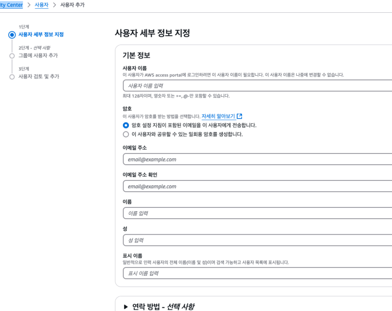 ๋ง์ฝ IAM Identity Center ์ธํ ์ด ๋์ด์์ง ์๋ค๋ฉด ๊ฑฐ๊ธฐ๋ก ์ด๋ํด์ ๋ง๋ค์ด์ผ ํ๋ค.