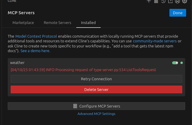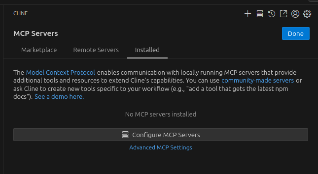 cline의 경우에는 상단 + 오른편의 버튼을 누르면 MCP 탭이 열리는데
