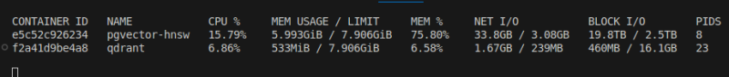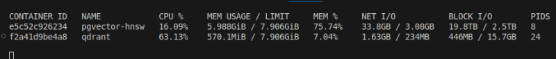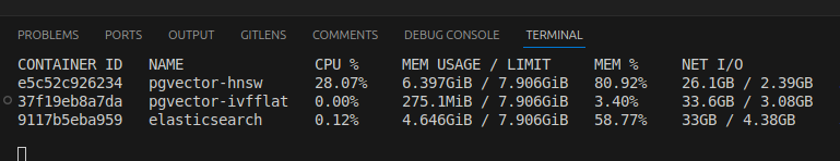 pgvector(hnsw)๋ ํนํ๋ ์ค๋ ๊ฑธ๋ ธ๋ค. ๋ฉ๋ชจ๋ฆฌ ๋ณ๋ชฉ์ ๊ฑธ๋ฆฐ๊ฑด์ง ๋ญ์ง๋ ์ ๋ชจ๋ฅด๊ฒ ๋ค.