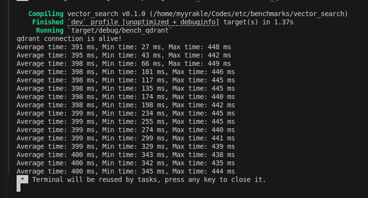 qdrant๋ ์ ์ฉ VectorDB์ธ ๊ฒ์ ๋นํด ํ๊ท ์ฒ๋ฆฌ๋์ ์๊ฐ๋ณด๋ค ๊ทธ๋ฆฌ ๋น ๋ฅด์ง๋ ์์๋ค.