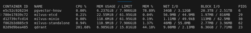 ๋ค๋ง qdrant๊ฐ ๋ ์ดํด์๋ณด๋ค๋ ๋ฉ๋ชจ๋ฆฌ ์ฌ์ฉ๋์ ์์ด์ ์ฅ์ ์ด ๋๋๋ฌ์ง ๊ฒ ๊ฐ๋ค. 1000๋ง๊ฐ ๋ฃ์๋๋ฐ๋ ํ์์ ๋ฉ๋ชจ๋ฆฌ ์ ์ ์จ์ด 1๊ธฐ๊ฐ ์กฐ๊ธ ๋๋ ์์ค์ด๋๋ผ. ๋ค๋ฅธ DB๋ค์ ํ์์์๋ ๋ฉ๋ชจ๋ฆฌ์ ๋๋ถ๋ถ์ ์ผ๋๋ฐ, ๋ฆฌ์์ค ํจ์จ์ฑ ์์ฒด๋ ์๋์ ์ด์๋ค.