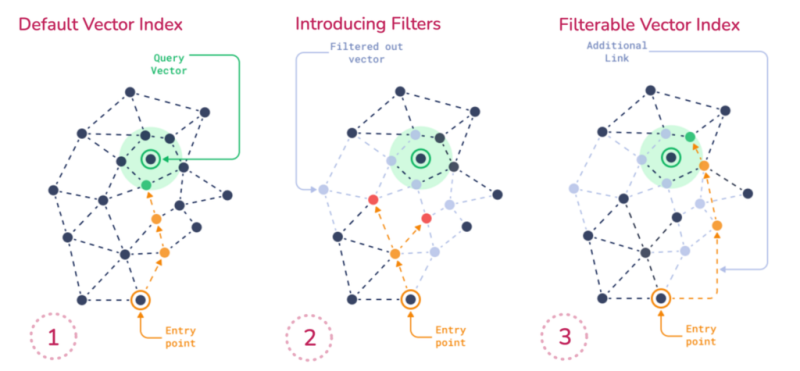 근데 필터링으로 막 거르다보면 탐색 경로가 끊기기가 쉬우니, qdrant의 경우에는 특수한 방법론을 통해 노드 간에 엣지를 추가해서, 탐색 경로를 인위적으로 확장하는 방식을 취한다.