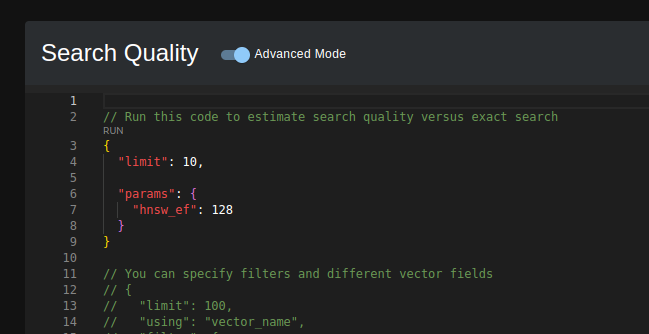 Qdrant UI์์๋ ๊ฒ์ ํ์ง์ ๊ฒ์ฌํ๊ธฐ ์ํ ๊ฐ๋จํ ๋๊ตฌ๋ฅผ ์ ๊ณตํ๋ค.