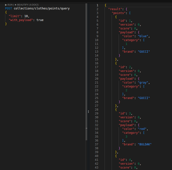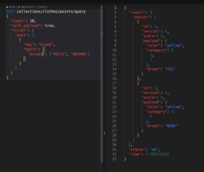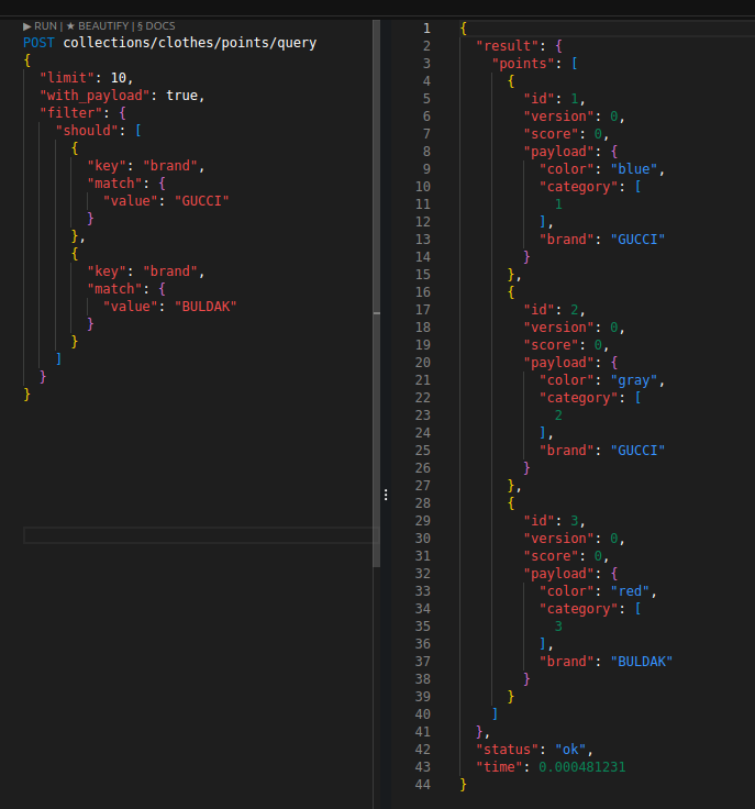 이를 통해 벡터 검색에서의 사전 필터링을 구현할 수 있고, 혹은 그냥 벡터 검색 없이도 인덱싱으로 꽤 빠르게 값을 가져올 수도 있다. 필터 성능은 Elasticsearch와 비교할 정도는 아니지만 그래도 제법 쓸만하다.