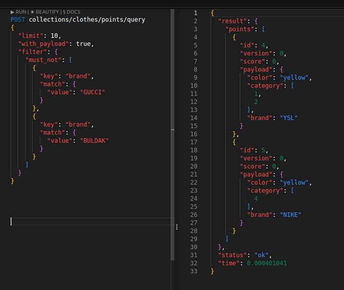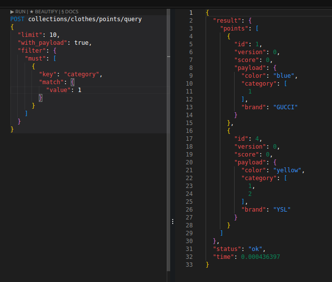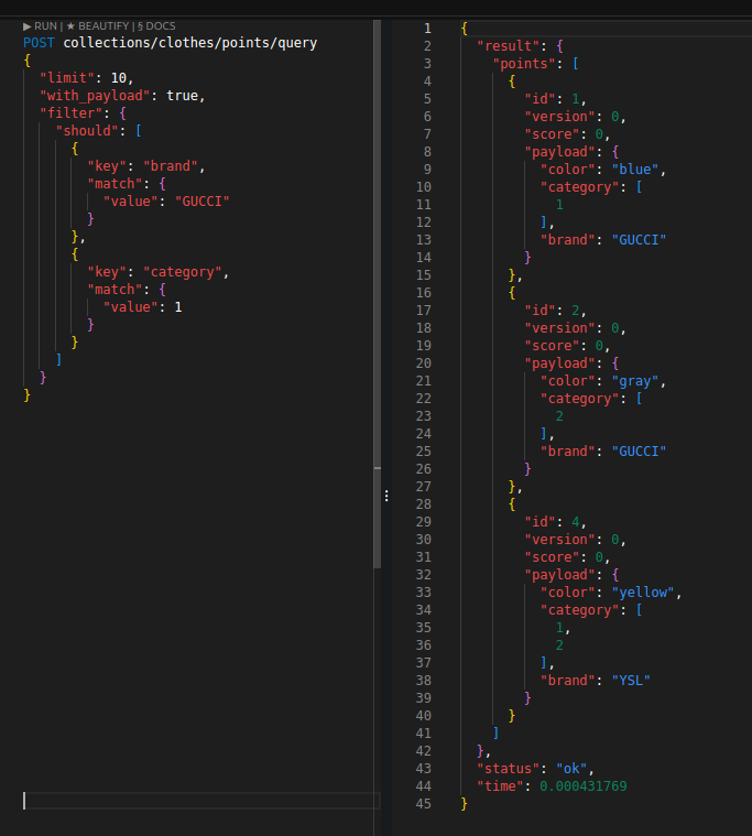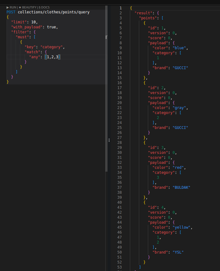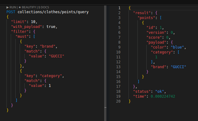 이를 통해 벡터 검색에서의 사전 필터링을 구현할 수 있고, 혹은 그냥 벡터 검색 없이도 인덱싱으로 꽤 빠르게 값을 가져올 수도 있다. 필터 성능은 Elasticsearch와 비교할 정도는 아니지만 그래도 제법 쓸만하다.