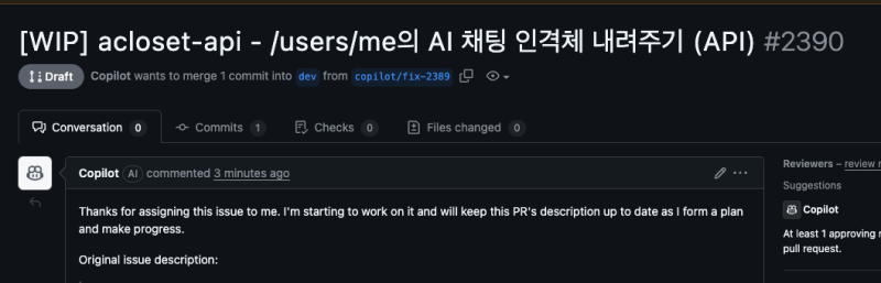 코파일럿을 할당하면, 바로 코파일럿이 그걸 인지해서 작업을 시작한다.