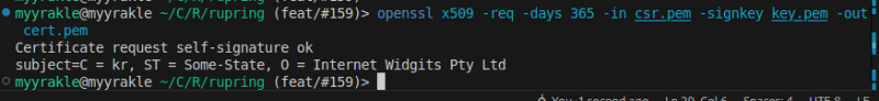 openssl x509 -req -days 365 -in csr.pem -signkey key.pem -out cert.pem