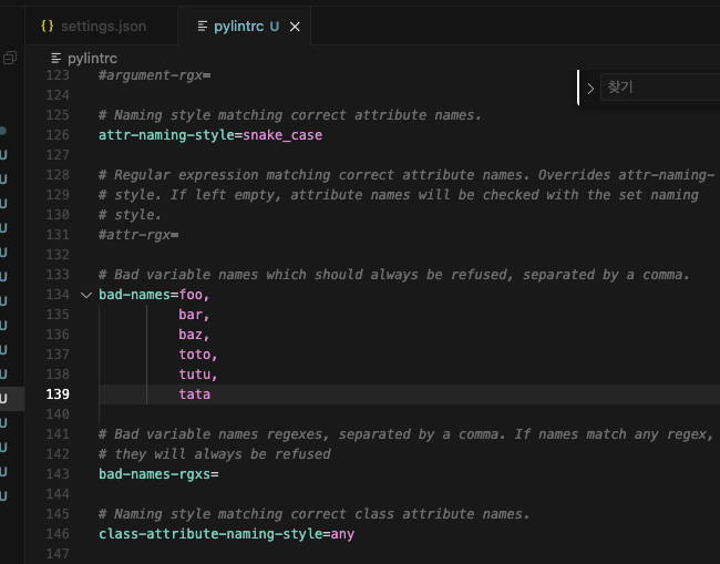 ํ๋ก์ ํธ ๋ฃจํธ ๊ฒฝ๋ก์ pylintrc๋ผ๋ ํ์ผ์ ๋ง๋ค๊ณ , ๊ฑฐ๊ธฐ์ ์ ๋นํ ์ํ๋ ๊ท์น์ ์ธํ