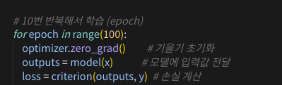 optimizer = optim.SGD(model.parameters(), lr=0.01) # 확률적 경사하강법
