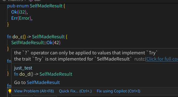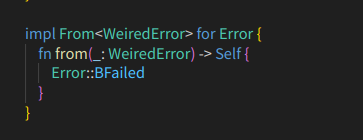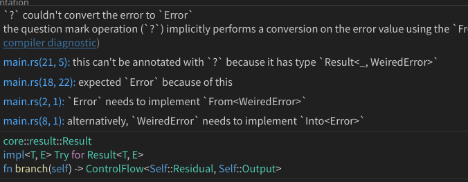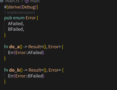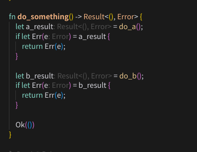 νμ§λ§ Rust μ²λΌ μ€λ₯λ₯Ό λͺ λ°±ν κ°μ μΌμ’ μΌλ‘ λ€λ£° κ²½μ°μλ, μμ μ½λμ²λΌ μ€λ₯μ λν΄μ λ§€λ² λ²κ±°λ‘κ² λΆκΈ°λ₯Ό μ³μ€μΌ νλ€.