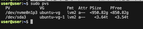 sudo pvs # PV(Physical Volume) 확인