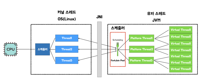virtual thread도 goroutine과 마찬가지로, 런타임에 의해서 실시간으로 Task들을 스케줄링한다.