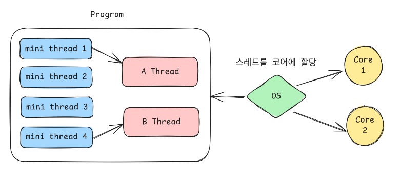 OS 스레드를 쓰긴 하나, 직접적으로 쓰지 않고 또 한 단계를 거쳐서 사용하는 것이다.
