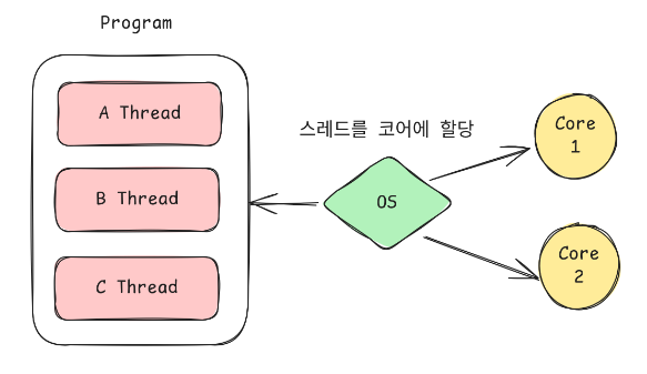 OS에서 제공하는 스레드를 사용하면 OS의 스케줄링에 따라서 멀티코어를 적당히 활용하게 된다.