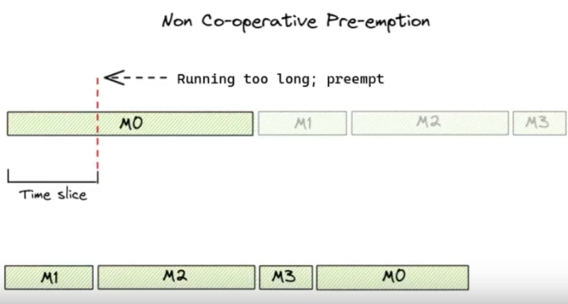 Go 스케줄러는 Time Slice라는 단위를 둬서, 일단 그 기간을 단위로 선점을 처리하는 방식을 취한다.