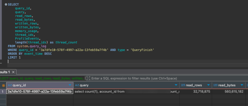 WHERE query_id = 'QueryID' AND type = 'QueryFinish'
