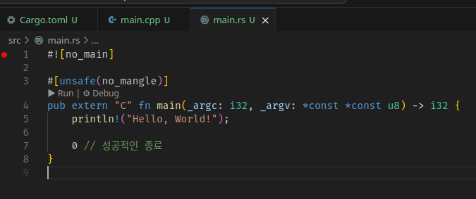 그 다음에 시도해볼만한 방법은, Rust의 main을 사용하지 않고 C 식으로 main을 export해서 암시적으로 진입점으로 쓰게끔 컴파일을 시키는 것이다.