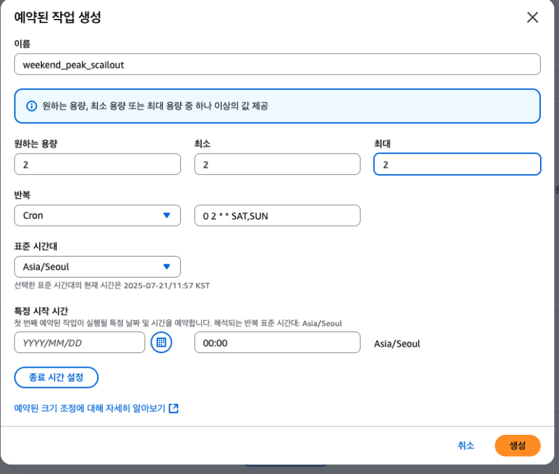 실제 사용사례에서는 사용량이 피크를 치는 지점이 거의 반복적으로 나타날 수 있고, 정해진 피크 시간에만 확장/축소되도록 하는 것이 효율적이고 적합할 수 있는 것이다.