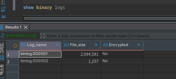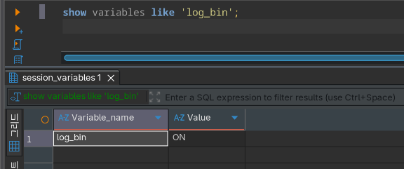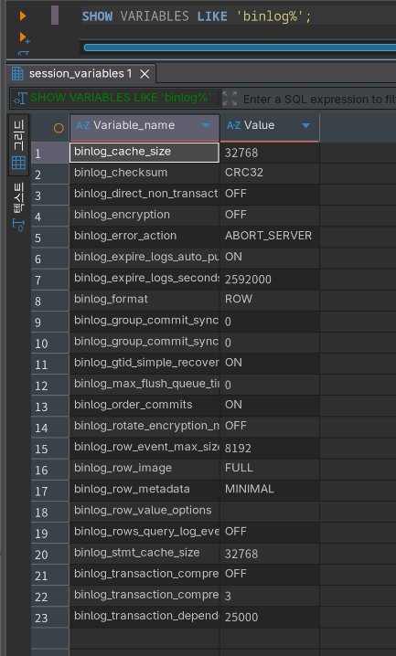 binlog가 활성화되어있는지 확인하려면, 다음 쿼리를 날려보면 된다.