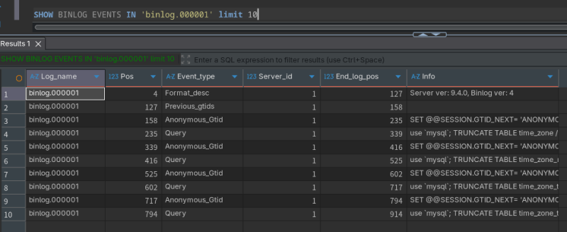 SHOW BINLOG EVENTS IN 'binlog.000001' limit 10SHOW BINLOG EVENTS IN 'binlog.000001' from 914 limit 10 # 그 다음 페이지 조회SHOW BINLOG EVENTS limit 10 # 전체 로그 다 보기