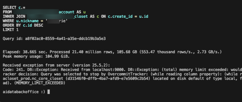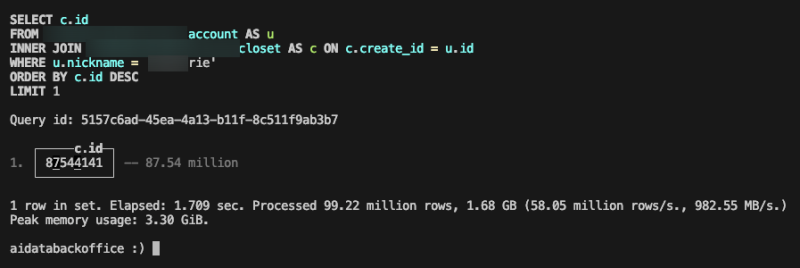 account라는 테이블은 1000만개 정도 되고, closet은 1억개 정도 되는 나름 대형 테이블이다.
