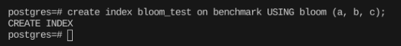 create index bloom_test on benchmark USING bloom (a, b, c);