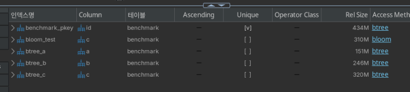 ์ ๊ฒ๊ณผ ๋น์ทํ ํจ๊ณผ๋ฅผ ๋ด๋ ค๋ฉด Btree์์๋ ์ปฌ๋ผ๋ง๋ค ์ธ๋ฑ์ค๋ฅผ ๋ง๋ค์ด์ผ ํ๋๋ฐ, ๊ทธ๋ฌ๋ฉด ์ด ๊ฒฝ์ฐ์๋ ์ธ๋ฑ์ค๋ง 700M์ฏค ๋จน๋๋ค.
