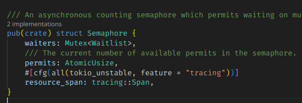 tokio์ Semaphore์ ๊ฒฝ์ฐ๋ฅผ ์๋ก ๋ค๋ฉด, Mutex์ Atomic ์นด์ดํธ๋ฅผ ํ๋ ๋๋ ๊ฒ์ผ๋ก ๊ตฌํ์ ํ๋ค.