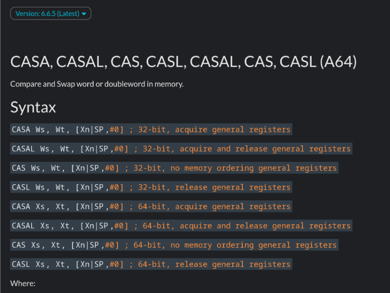 https://developer.arm.com/documentation/dui0801/l/A64-Data-Transfer-Instructions/CASA--CASAL--CAS--CASL--CASAL--CAS--CASL--A64-