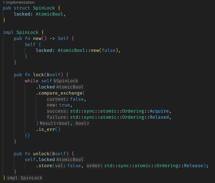 ์คํ๋ฝ์ ๊ตฌํํ๋ ๊ฐ์ฅ ์ฝ๊ณ ์ผ๋ฐ์ ์ธ ๋ฐฉ๋ฒ๋ bool flag๋ฅผ ๋๊ณ CAS๋ก ๋ฌดํ๋ฃจํ๋ฅผ ๋๋ฆฌ๋ ๊ฒ์ด๋ค.