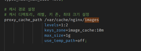 # 캐시 디렉토리, 레벨, 키 존, 최대 크기 설정