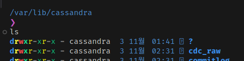 cassandradb๋ฅผ ์ฌ๋ถํ ํด๋ณด๋ฉด, ๋ฐ์ดํฐ ๋๋ ํ ๋ฆฌ์ cdc_raw๋ผ๋ ํด๋๊ฐ ์๊ธด๋ค.
