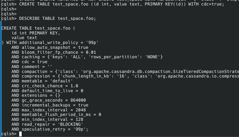 CREATE TABLE test_space.foo (id int, value text, PRIMARY KEY(id)) WITH cdc=true;