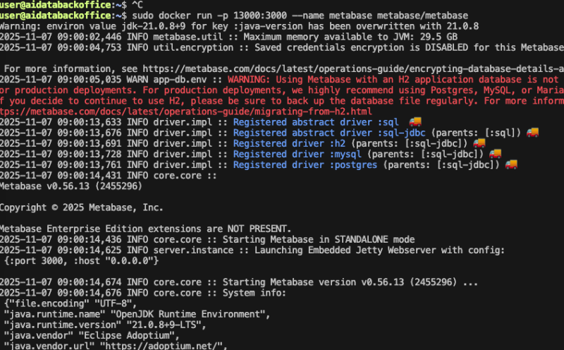 docker run -d -p 13000:3000 --name metabase metabase/metabase