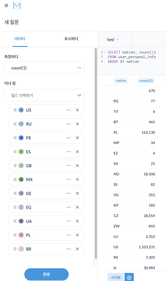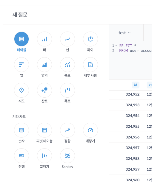 쿼리 창에서 시각화 버튼을 누르면 바로 컬렉션 생성 모드로 진입할 수 있다.