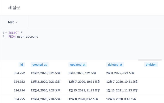 위에서 날짜를 선택해서 지정하면, 그에 맞춰서 쿼리가 실행된다.