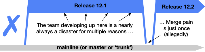 ๊ทธ๋์ trunk base์์๋ ๊ฐ๋ฐ ์์ ๋ธ๋์น๋ ๋๋๋ก ๋จ์ผ ๋ธ๋์น๋ก๋ง ์ก๊ณ , ๋น ๋ฅด๊ฒ ์์ ์์ ๋จ์๋ก merge๋ฅผ ํ๋ ๊ฒ์ ๊ถ์ฅํ๋ค.