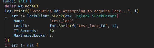 log.Printf("Goroutine %d: Failed to acquire lock: %v", i, err)