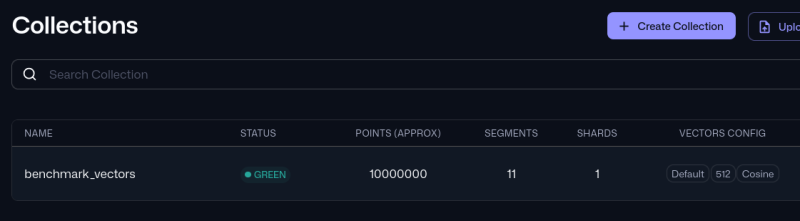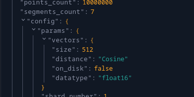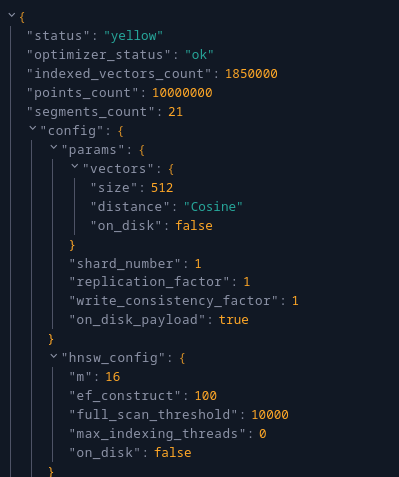 테스트에 사용한 구성은 512 차원의 Cosine 벡터, HNSW 인덱스를 전부 메모리에 올리는 구성이다.