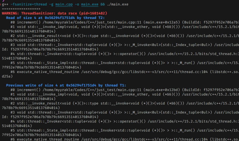 g++ -fsanitize=thread -g main.cpp -o main.exe && ./main.exe