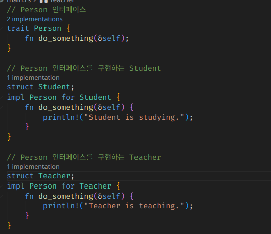 ๋ค์ ์ฝ๋๋ Person์ด๋ ์ธํฐํ์ด์ค๋ฅผ ์ ์ํ๊ณ , ๊ฐ ๊ฐ์ฒด๋ค์ด ์ธํฐํ์ด์ค๋ฅผ ๊ตฌํํ๋ ๊ฒ์ผ๋ก ๊ฐ์ฒด์ ํ์ ๋ณ ๋์์ ๋ค๋ฅด๊ฒ ๊ตฌํํ๋ค.