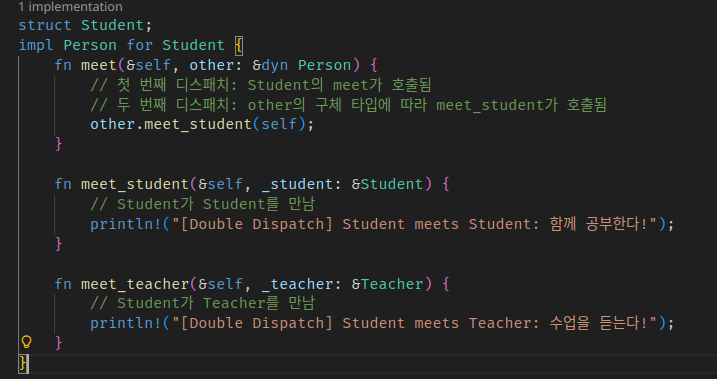 ์ฌ์ฉ์๊ฐ ์ฌ์ฉํ ๋๋ ์ฒ์ meet์ผ๋ก ๊ฐ์ฒด ๋ถ๊ธฐ๋ฅผ ํ๊ณ (first dispatch), other์ ๊ฐ๋ณ meet์ ๋ถ๋ฅด๋ฉด์ 2๋ฒ์งธ ๊ฐ์ฒด ๋ถ๊ธฐ๋ฅผ ํ๋ค. ๊ทธ๋์ double dispatch๋ค.