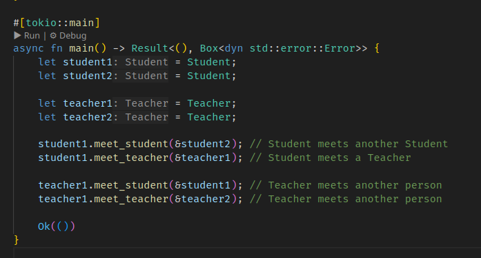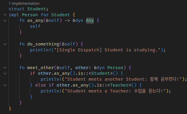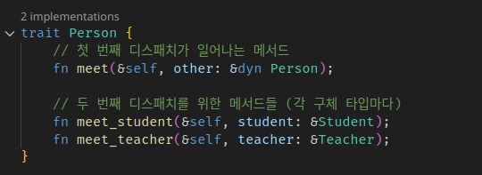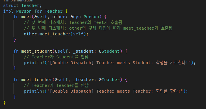 ์ฌ์ฉ์๊ฐ ์ฌ์ฉํ ๋๋ ์ฒ์ meet์ผ๋ก ๊ฐ์ฒด ๋ถ๊ธฐ๋ฅผ ํ๊ณ (first dispatch), other์ ๊ฐ๋ณ meet์ ๋ถ๋ฅด๋ฉด์ 2๋ฒ์งธ ๊ฐ์ฒด ๋ถ๊ธฐ๋ฅผ ํ๋ค. ๊ทธ๋์ double dispatch๋ค.